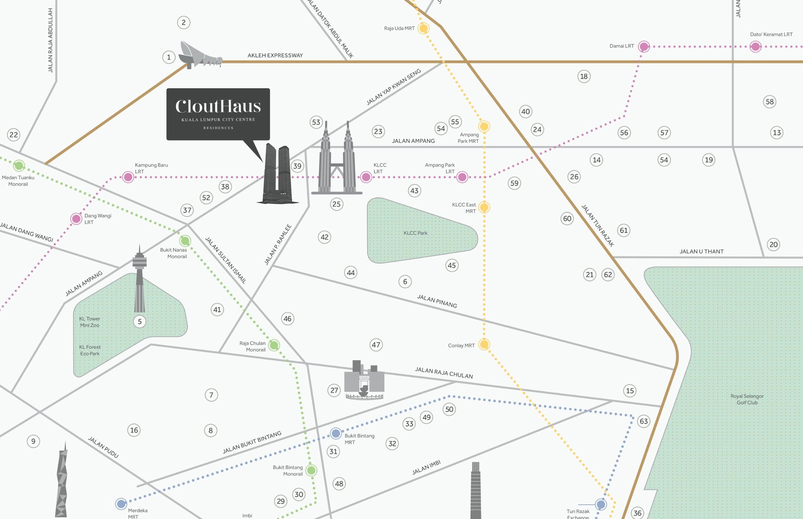 Located within Kuala Lumpur City Centre, CloutHaus places residents close to major landmarks, offices, shopping malls, and lifestyle attractions. The development is well connected to key roads and public transportation, making daily commuting and city access convenient for residents. Nearby highlights include shopping malls, business districts, dining destinations, entertainment venues, and public transportation links within Kuala Lumpur.