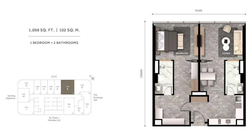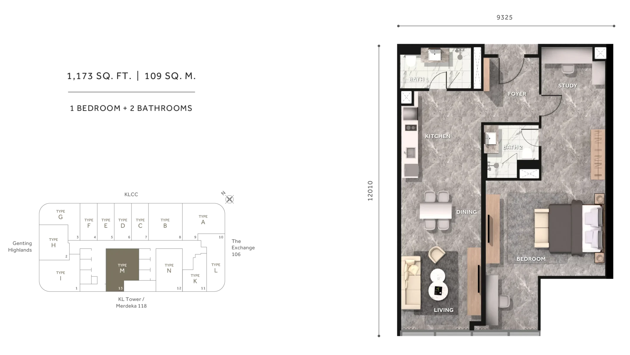 Type I | 1,173 sq.ft. | 1BR + Study