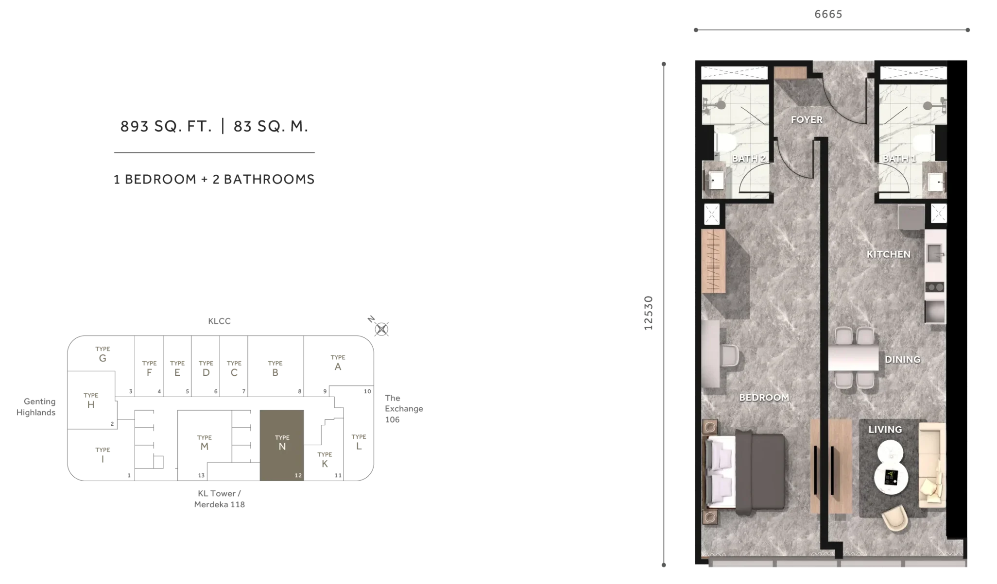 1 Bedroom + 2 Bathroom